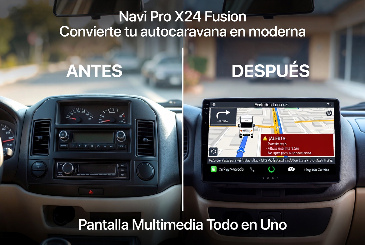 NEW NAVI PRO X24 FUSION 9” – Pantalla multimedia portátil con 2 GPS profesionales diseñada para autocaravanas, caravanas, campers, camiones y autobuses (vehículos grandes). Convierte tu vehículo en uno moderno con un sistema todo en uno que combina pantalla multimedia, conectividad y navegación profesional avanzada. 👉 ¿Tu vehículo no tiene pantalla moderna? 💥 Este dispositivo lo soluciona todo en uno solo ✔ Pantalla multimedia de 9” tipo vehiculo moderno Programas incluidos y actualizaciones El Navi Pro X24 Fusión incluye todos los programas de navegación ya instalados y listos para usar, sin pagos adicionales. ✅ Programas totalmente gratuitos Gracias a su conexión a internet, podrás actualizar fácilmente directamente desde el propio GPS. 🛰️ Navegación inteligente: